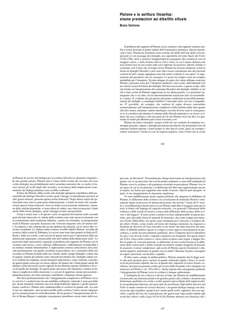 Settima lettera : Platone, Forcignanò, Filippo: Amazon.it: Libri Questo articolo: Settima lettera. da Platone Copertina flessibile. 14,25 €. Disponibilità immediata. Venduto e spedito da Amazon. La filosofia di Platone. Verità e ragione umana. da Franco Trabattoni Copertina flessibile. 25,65 €. Platone: commento alla lettera VII di Platone e ... - Google Groups Così Platone, ormai vecchio, scrive nella VII Lettera, ricordando gli anni e le speranze della sua giovinezza, quelle speranze cl1e si condensano in un unico, grande desiderio: appena diventato... PDF Platone: La Lettera VII - heinlow Platone: La Lettera VII Assieme alla Lettera VIII, è oggi considerata dalla stragrande maggioranza degli studiosi l'unica delle tredici lettere tradizionalmente attribuite a Platone ragionevolmente riferibile al filosofo ateniese. Lettera VII DI Platone finita - StuDocu Platone si reca tre volte a Siracusa.) Nonostante il fallimento del suo piano, la VII Lettera Il sogno, forse utopico, di Platone era quello di realizzare una perfetta sincronia tra governante e buon governo. Un buon governante è colui che non agisce per interesse personale e ha come fine il bene comune.